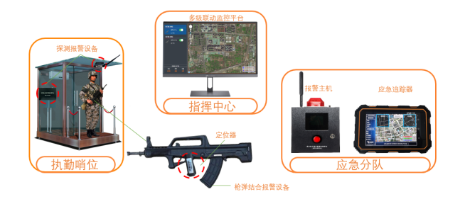 槍支部分負(fù)責(zé)定位及測(cè)距信號(hào)發(fā)射,哨位部分負(fù)責(zé)測(cè)距信號(hào)接收、檢測(cè)槍支在位狀態(tài)和向監(jiān)控指揮中心發(fā)送槍支離位報(bào)警信號(hào),監(jiān)控指揮中心負(fù)責(zé)24小時(shí)監(jiān)控和實(shí)時(shí)報(bào)警,應(yīng)急分隊(duì)負(fù)責(zé)突發(fā)事件應(yīng)急聯(lián)動(dòng)處置。